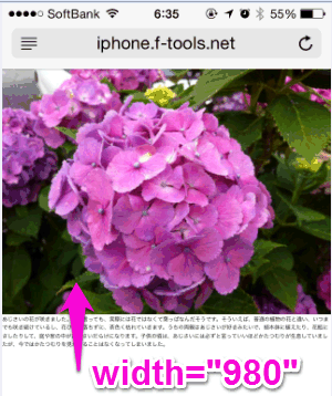こちらは、画像の幅を980ピクセルに指定して作成したページをiPhoneで表示したものです。