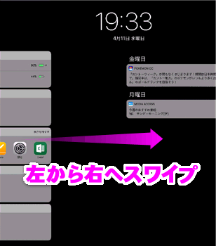 iPadの画面上端から下に指でなぞる(スワイプ)と、「通知センター」と呼ばれるメールなどの通知画面が表示されます。