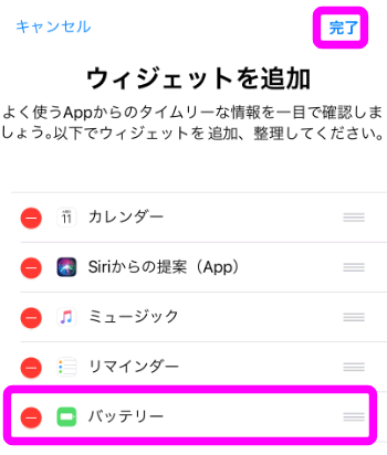 「追加するウィジェット」の中から「バッテリー」を探し、左側にあるプラスのボタンをタップします。