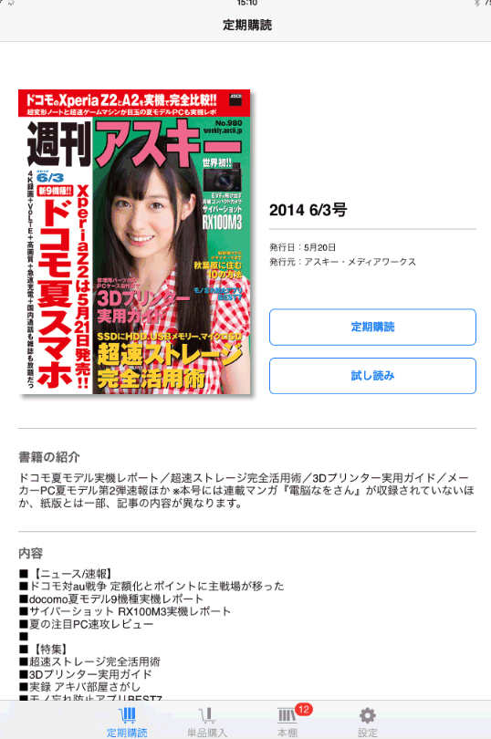 私が購入している雑誌版の週刊アスキー。毎回iPadで読めるようにスキャナーでPDFにしてたのですが、ようやく電子書籍版のアスキーが発売されました。