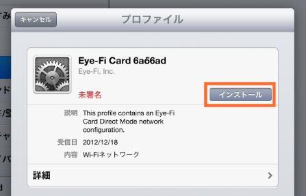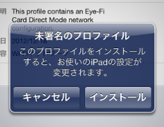 このプロファイルをインストールすると、デジカメに差し込んだEye-FiのSDカードが発するWi-Fiに自動でログインすることができます(先程のパスワードを入力しなくてもいい)。