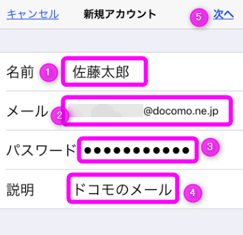 入力し終わったら、右上の⑤「次へ」をタップします。