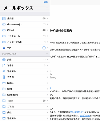 メールアプリを開き、メールボックスを見てみるとドコモメールが追加されていました。