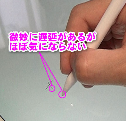 Appleの公式サイトでは、Apple Pencilの遅延(公式サイトではレイテンシと呼んでいますが)がほぼ0と書かれていますが、実際には素早くペンを動かすと若干遅延があります。とはいえほとんど人間の目には認識できないレベル。