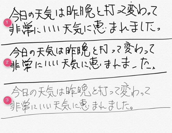 3つのスタイラスペンを使って、同じアプリ(メモ帳)で同じ文章を入力してみました。