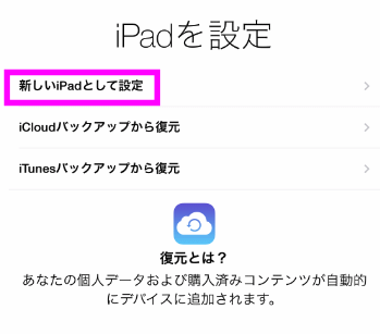 もし、新しく購入した場合は「新しいiPadとして設定」をタップしてください。