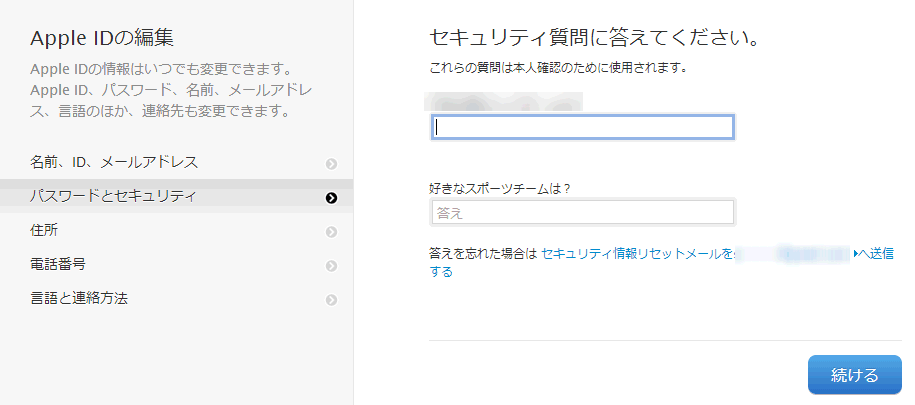 iPhone(もしくはiPad)でApple IDを作成した時の秘密の質問2つの答えを入力します。