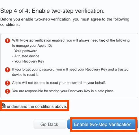 「understand the conditions above.(上記の条件を理解しています)」にチェックを入れ、「Enable two-step Verification(2段階認証を有効にする)」をタップします。