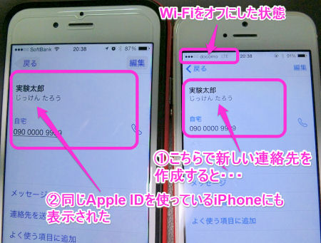 基本的にiCloudへのバックアップは、Wi-Fiで接続した状態でないと実行できません。が、連絡先のバックアップは3G回線やLTEでも行われるようで、Wi-Fiをオフ(右側の端末)させた状態で新たな連絡先を追加したら、同じiCloudを使用している端末(左側)もすぐに反映されました。