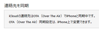 ここが、「iCloudの連絡先はOTA(Over The Air)でiPhoneと同期中です」と表示されている場合は、iCloud経由で同期されているので、Windowsとは同期できません。