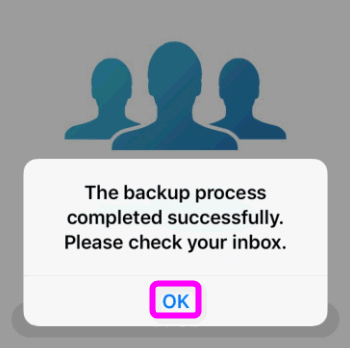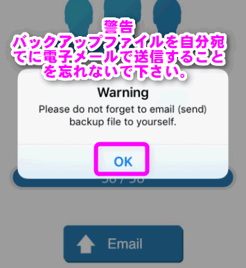 英語で「バックアップは成功しました。メールボックスをチェックしてください」というような表示になるので、「OK」をタップします。