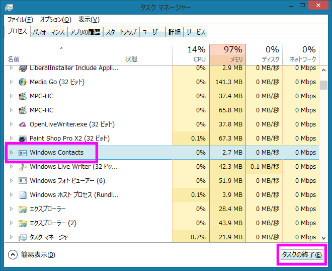 もし開いてしまったら、「タスクマネージャ」を開き、「Windows Contacts」をクリックし、右下の「タスクの終了」をクリックして強制終了させてください。