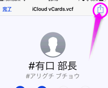 この状態でもう一度先程のダイヤルをタップし、今度は②「vCardを書き出す」をタップしてください。