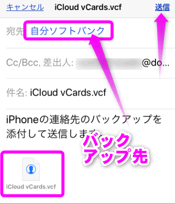 復元したいiPhoneで、送信したメールを開くと「MyContect...vcf」というようなファイルが添付されています。