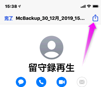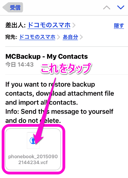 なので、上のバックアップした時に送った自分宛てのメールを開き、添付されているファイルをタップします。