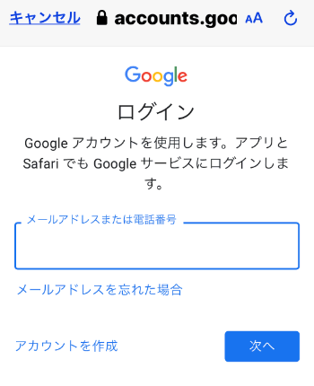 Googleアカウントのメールアドレスを入力し、「次へ」をタップします。
