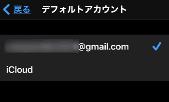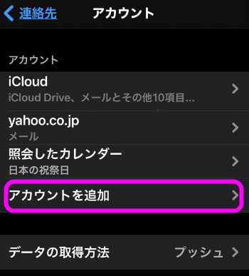 登録してあるアカウントが表示されます。ここで「iCloud」はAppleアカウントの連絡先(最初からあるアカウント)になります。