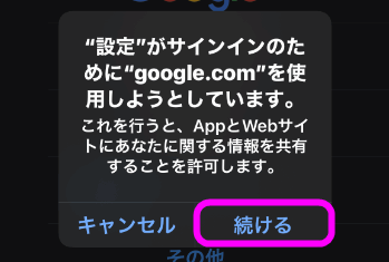 Googleアカウントにアクセスしていいか聞いてくるので「続ける」をタップ。