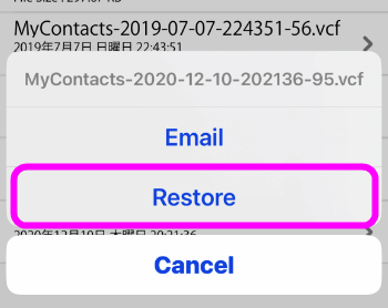 「In App vCard Restore」というボタンがあるので、ここをタップします。