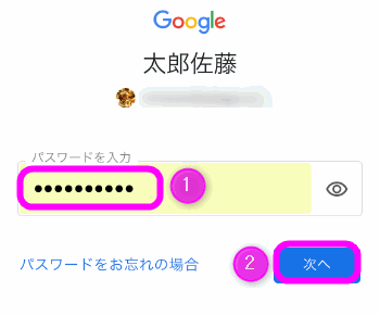①パスワードを入力し、②「次へ」をタップします。