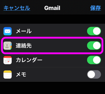 「連絡先」をオン(黄緑)にし、右上の「保存」をタップします。