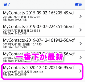 バックアップした連絡先のデータの一番最初(もしくは最後)の連絡先が表示されるので、右上の