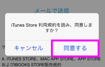 iTunes Storeの利用条件とアップルのプライバシーポリシーが表示されるので、目を通したら右下の「同意する」をタップします。