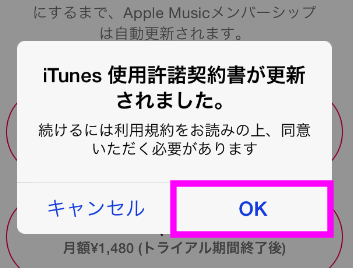 iOS8.4にアップグレードしたあとだと、このようなiTunes 使用許諾契約書が更新されました。という警告が表示されるので、「OK」をタップしてください。