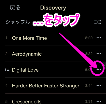 ダウンロードするには、曲名などの右横にある「 ... 」の部分をタップします。