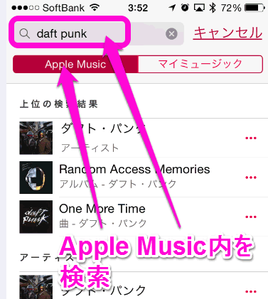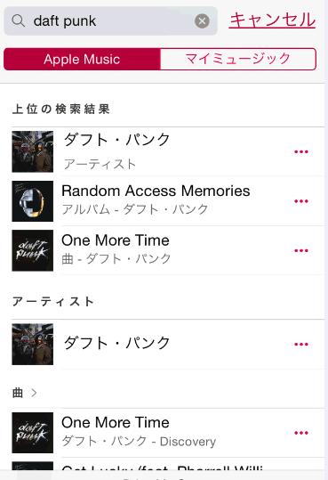 すると、Apple Musicで見つかった候補の曲やアーチストが表示されます。