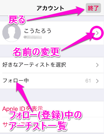「姓名」や「ニックネーム(ツイッターアカウントのようなもの)」、フォロー中のアーティストを見ることが出来ます。