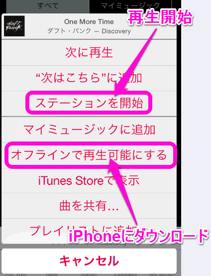ダウンロードしなくても「プレイリストに追加」や曲を購入する「iTunes Storeで表示」なども選択できます。