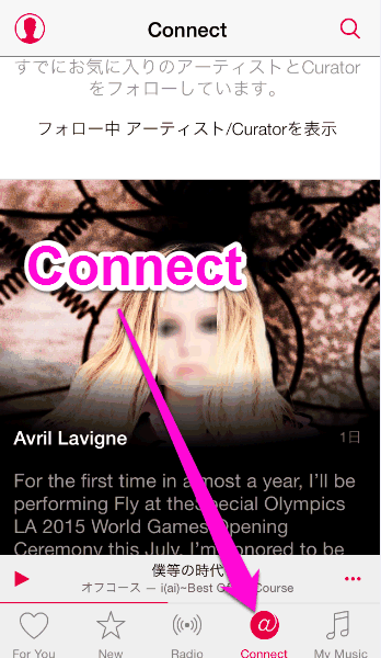 この「Connect」とは、Apple版のツイッターのようなもので、アーティストのつぶやきや更新データをチェックしたり、つぶやきを投稿したりすることが出来る機能っぽい。