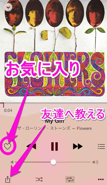 左下の「共有」ボタンをタップすると、友達に曲やアーティスト、アルバムを紹介することも出来ます。