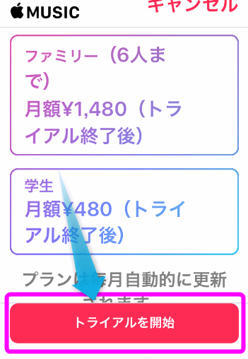 下にスクロールすると、トライアルを開始」というボタンがあるので、ここをタップします。