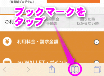 Safariを立ち上げ、画面右下の丸で囲まれた部分(ブックマーク)をタップします。