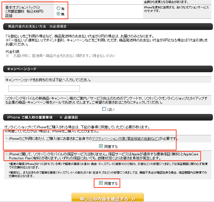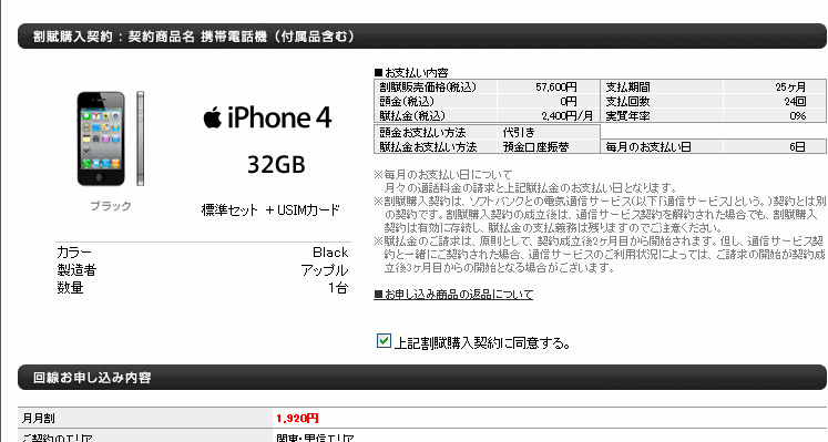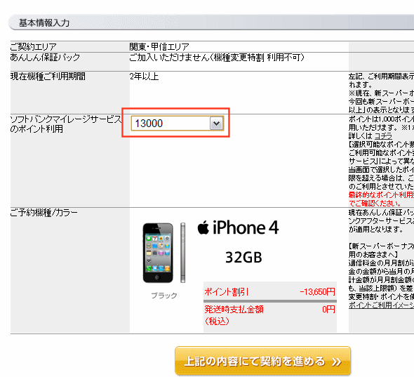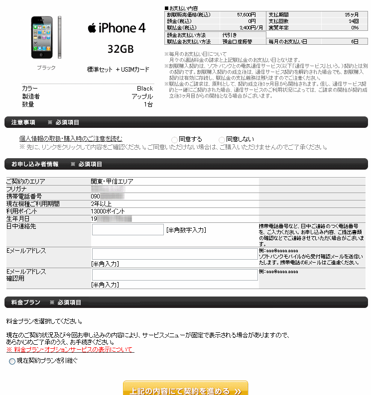 iPhone 4 の32GBを選んで「新スーパーボーナス2年払い」を選択しました。