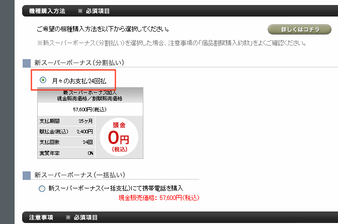 なお、初期状態で一括払い(新スーパーボーナス一括購入)が選択されているので注意が必要です。