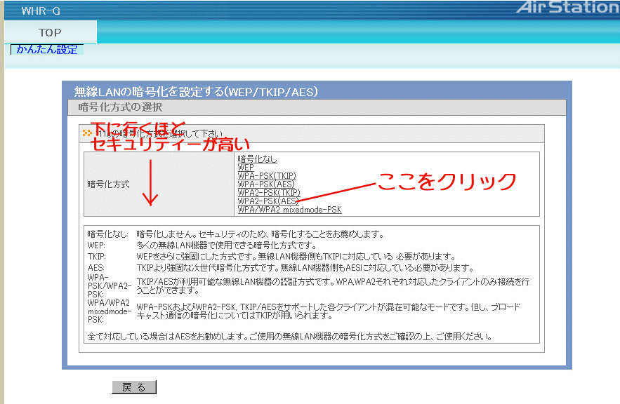 左のような画面が表示されるので、「無線の暗号化を設定する」をクリック。