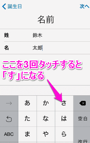例えば「す」を入力するには、「さ」を3回連続でタッチすると「す」になります。