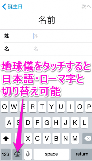 日本語入力するには、キーボードの地球儀のボタンをタップします。