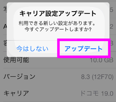 もし、最新のキャリア設定でない場合、このように「キャリア設定アップデート」が表示されるので、「アップデート」をタップしてください。