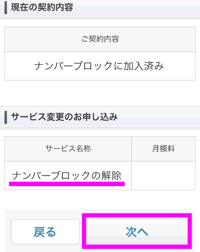 ナンバーブロックの解除が表示されるので、「次へ」をタップします。