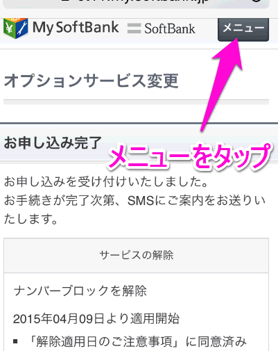 ナンバーブロックの解約はすぐに反映されます。右上の「メニュー」をタップします。