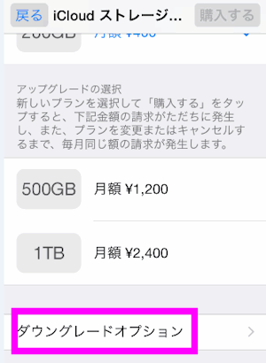 「iCloudストレージ」の容量選択画面で、「ダウングレードオプション」をタップします。