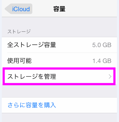 先ほどの「設定」→「iCloud」→「ストレージを管理」まで進み、「iPhone」をタップします。