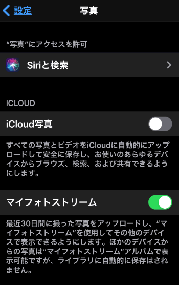もし、このようにフォトライブラリの容量が大きい場合、ここをタップしてオフにします。