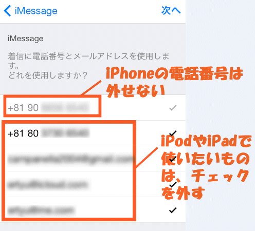 このまま全てチェックを入れてもいいのですが、もし、iPhoneを複数持っていたり(家族とか)、iPod touchやiPadを持っていて、そちらでもiMessageを使いたい場合は、いくつかチェックを外しておきます。というのも、別のiPhoneなどで同じメールアドレスや電話番号にチェックが入っていると、友だちから送られてきたメッセージが、それぞれにiMessageが届いてしまうためです。