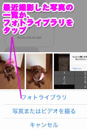 最近撮影した写真の一覧が表示されるので、その中から写真を選択してもいいし、「フォトライブラリ」を選択して、iPhoneに保存された写真を選択することも出来ます。