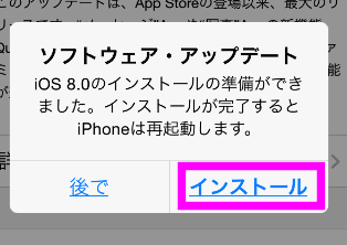 ソフトウェア・アップデートというダイアログが表示されるので、「インストール」をタップします。